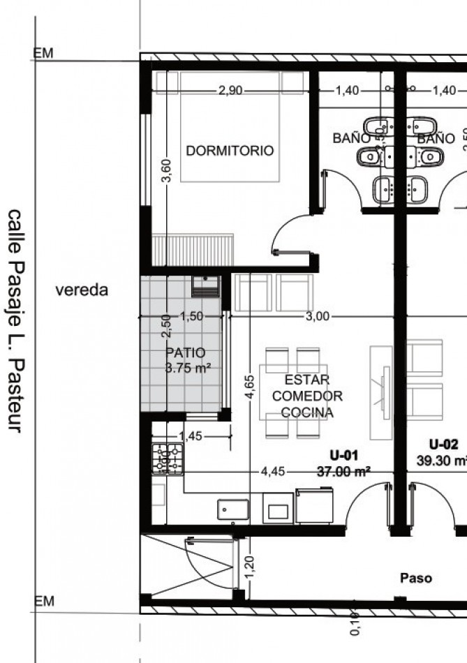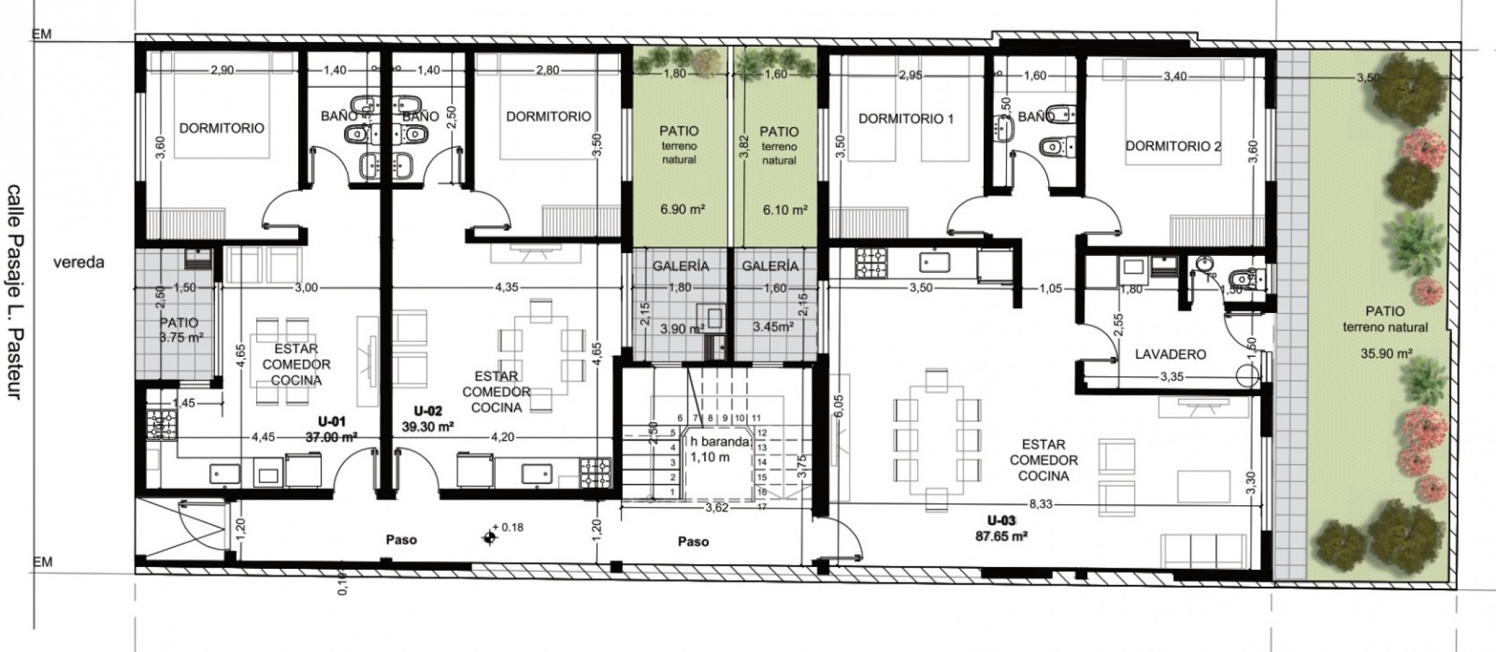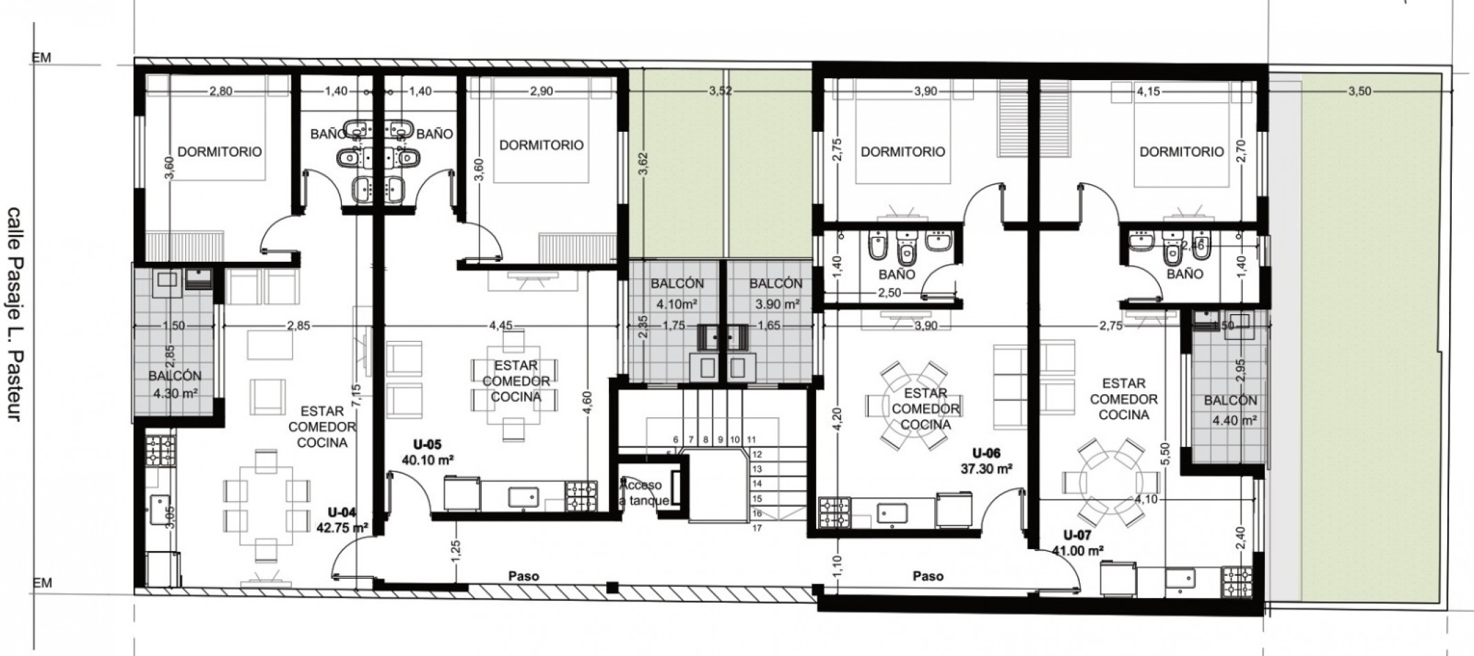 Departamentos en construcción de un dormitorio en Barrio Fomento 9 de julio, a metros de calle Domingo Silva y a 150 mts. de Av. Aristóbulo del Valle. Ubicado sobre Pje. Pasteur N°3900, el edificio se desarrolla en planta baja y planta alta. Posee siete unidades funcionales. Excelente calidad constructiva: pisos de porcelanato, aberturas de aluminio línea modena con DVH.