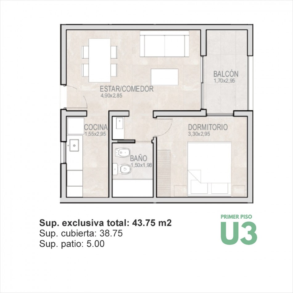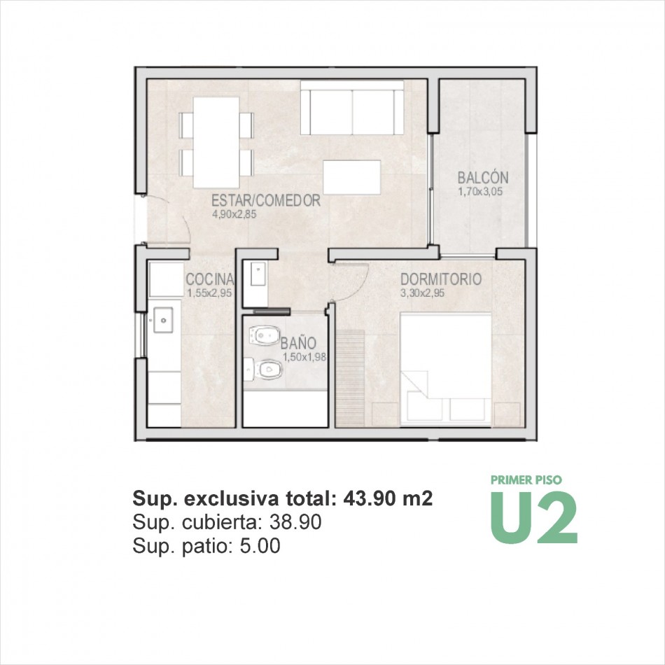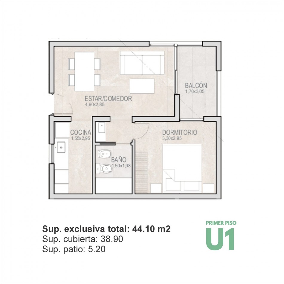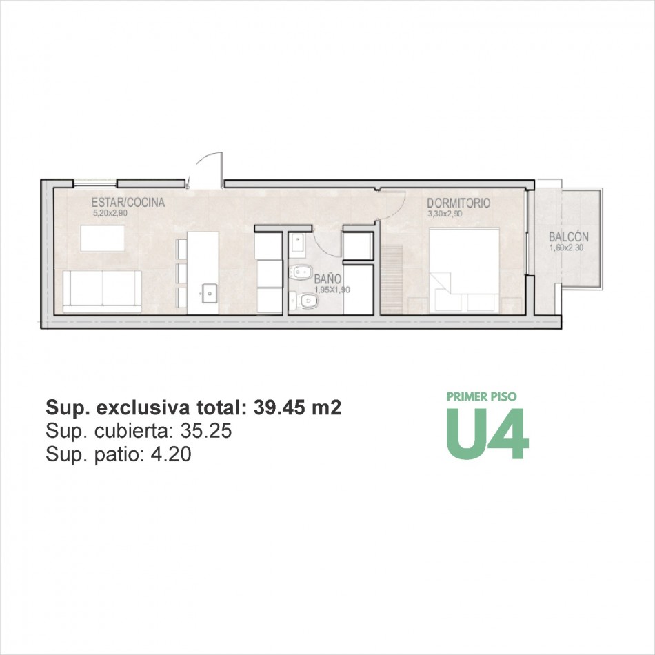 Ambientes: estar-comedor, cocina, baño, un dormitorio y patio/balcón.